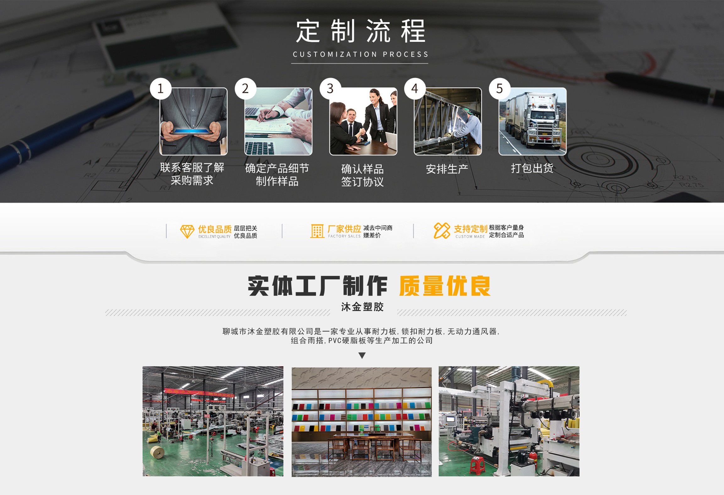聊城市沐金塑膠有限公司注冊資金2180萬元,占地20000余平方,擁有自建廠房15000平方,員工100余名。10余年來,公司主營耐力板,鎖扣耐力板,耐力板深加工,無動力通風(fēng)器,組合雨搭,PVC硬脂板,耐力板廠家等板材的發(fā)展戰(zhàn)略,逐漸成長為綜合性企業(yè)?! 」緭碛卸鄺l板材共擠生產(chǎn)線,采用世界知名品牌進(jìn)口原材料和先進(jìn)工藝,依據(jù)完善的ISO9001質(zhì)量管理體系和ISO14001環(huán)境管理體系,為產(chǎn)品的卓越品質(zhì)提供了強(qiáng)有力的保證。憑借過硬的創(chuàng)新能力和堅實的硬件基礎(chǔ),贏創(chuàng)已成為國內(nèi)領(lǐng)先的熱塑性板材生產(chǎn)商,產(chǎn)品被廣泛應(yīng)用于建筑業(yè)、農(nóng)業(yè)、工業(yè)、廣告業(yè)、安防行業(yè)及DIY領(lǐng)域?! 」臼冀K致力于通過提供最優(yōu)的板材應(yīng)用解決方案,為客戶創(chuàng)造最高的價值;堅守創(chuàng)新、質(zhì)量、靈活、服務(wù)和速度的核心價值觀;堅持“完美的產(chǎn)品需要完美服務(wù)的支持”的經(jīng)營理念,努力實現(xiàn)成為世界領(lǐng)先的板材與解決方案供應(yīng)商的夢想。 在未來,公司將立足客戶需求,不斷改變和完善現(xiàn)有產(chǎn)品,拓展產(chǎn)品線和充分開發(fā)板材的應(yīng)用領(lǐng)域,為客戶創(chuàng)造全方位的價值。同時更好地實現(xiàn)員工的價值,實現(xiàn)公司團(tuán)隊的價值。我們將與您一起創(chuàng)贏未來! 企業(yè)使命:成為世界領(lǐng)先的板材與解決方案供應(yīng)商。 公司愿景:通過提供最優(yōu)的板材應(yīng)用解決方案,為客戶創(chuàng)造最高的價值。 核心價值觀:質(zhì)量...